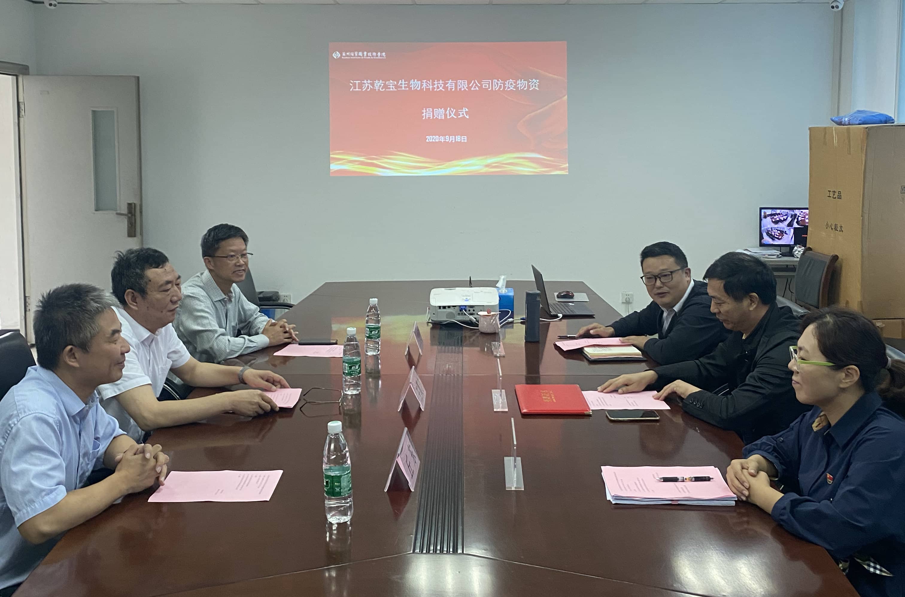 2020年9月18日上午,江蘇乾寶生物科技有限公司(簡(jiǎn)稱“乾寶生物科技”)防疫物資捐贈(zèng)儀式在蘇州經(jīng)貿(mào)職業(yè)技術(shù)學(xué)院行政樓舉行,江蘇乾寶集團(tuán)總裁王翼寧、江蘇乾寶生物科技有限公司總經(jīng)理丘東、太湖書(shū)院執(zhí)行院長(zhǎng)王建明、蘇州經(jīng)貿(mào)職業(yè)技術(shù)學(xué)院副院長(zhǎng)沈文其、后勤管理處處長(zhǎng)蔡達(dá)君、后勤管理處科長(zhǎng)陸體艷出席了捐贈(zèng)儀式。蔡達(dá)君處長(zhǎng)主持了捐贈(zèng)儀式,并介紹了出席儀式的嘉賓。