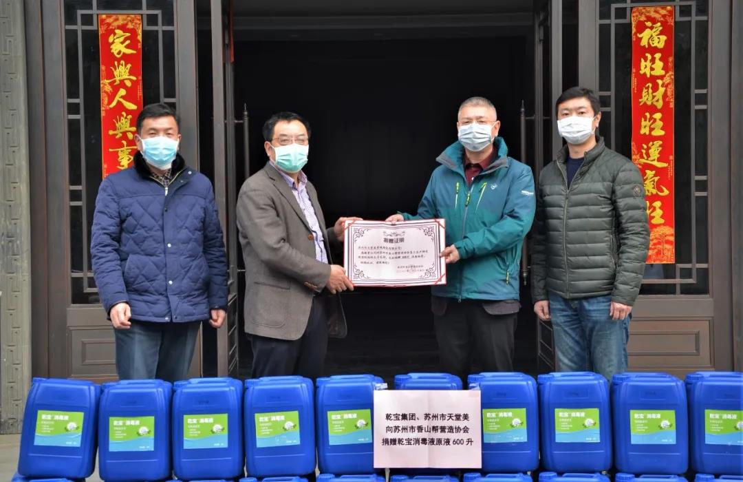 隨著企業(yè)陸續(xù)復(fù)工,疫情防控工作進入防疫和復(fù)工“兩手抓”階段。2020年2月25日,乾寶集團再次伸出援助之手,旗下企業(yè)蘇州市天堂美景觀綠化工程有限公司向蘇州市香山幫營造協(xié)會捐贈消毒液原液600升,以實際行動支援蘇州市香山幫營造協(xié)會內(nèi)園林古建企業(yè)的疫情防控和復(fù)工工作。