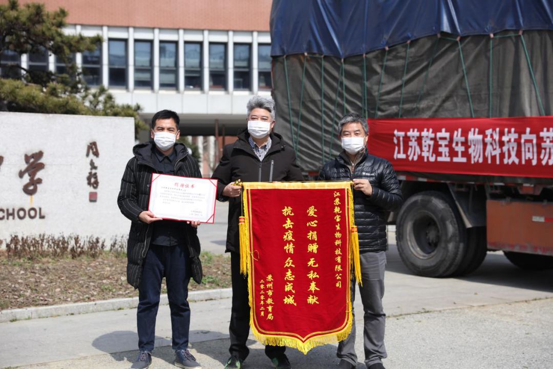 蘇州教育局副調(diào)研員汪濤(中)代表市教育局接收物資并向乾寶生物科技有限公司贈送“愛心捐贈無私奉獻,抗擊疫情眾志成城”的錦旗