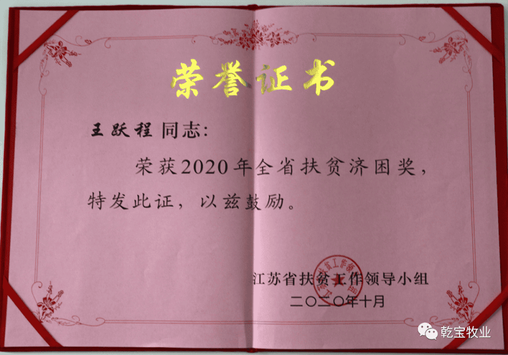 10月17日,在第七個(gè)全國(guó)扶貧日到來(lái)之際,省政府召開脫貧攻堅(jiān)表彰大會(huì),江蘇乾寶牧業(yè)有限公司董事長(zhǎng)王躍程獲得了省扶貧濟(jì)困獎(jiǎng)。這是對(duì)王躍程董事長(zhǎng)多年來(lái),牢記企業(yè)家社會(huì)責(zé)任,以產(chǎn)業(yè)報(bào)國(guó),以產(chǎn)業(yè)惠民所作貢獻(xiàn)的肯定和褒獎(jiǎng)。