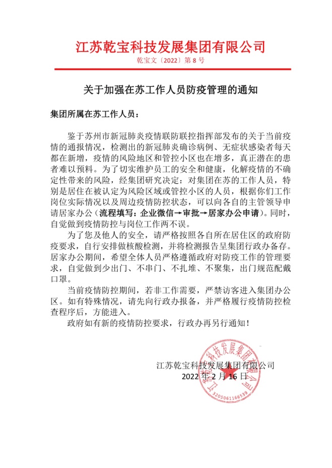 2月13日,乾寶集團(tuán)緊鑼密鼓準(zhǔn)備的全集團(tuán)2021年度工作總結(jié)會(huì)暨2022年新年工作會(huì)議準(zhǔn)備就緒,分布江蘇各地的集團(tuán)各版塊與會(huì)代表紛紛前往集團(tuán)總部報(bào)到參會(huì)。2月14日早晨,當(dāng)集團(tuán)董事長(zhǎng)王躍程獲悉了蘇州市新冠疫情聯(lián)防聯(lián)控指揮部于當(dāng)日凌晨發(fā)布的《蘇州市疫情防控2022年第7號(hào)通告》后,以高度的政治站位和大局意識(shí),嚴(yán)格執(zhí)行關(guān)于“全面加強(qiáng)社會(huì)面管控,取消全市各類公眾聚集性活動(dòng)”的通告精神,立刻作出了“關(guān)于馬上取消14號(hào)全天的集團(tuán)新年工作會(huì)議”的果斷決定。同時(shí),緊急部署防疫抗疫工作,迅速安排外地與會(huì)代表有序返程,要求認(rèn)真按照當(dāng)?shù)胤揽匾咔榈囊?guī)定,自覺做好核酸檢測(cè)和自我隔離工作。集團(tuán)總部立即召開疫情防控工作部署會(huì)議,明確要求集團(tuán)上下積極行動(dòng)起來,自覺做到“少出門、不串門、不扎推、不聚集,規(guī)范佩戴口罩”。