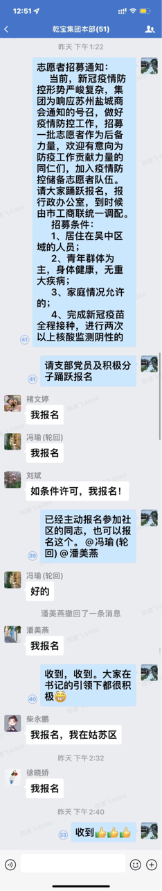 2月18日,集團(tuán)總部發(fā)出“抗疫志愿者招募通知”,黨員和入黨積極分子率先積極響應(yīng),起到了良好的帶頭示范作用。在蘇的集團(tuán)企業(yè)板塊和太湖書院各位同仁也紛紛踴躍報(bào)名,迅速組建起了一支抗疫志愿者隊(duì)伍。